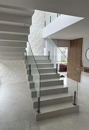 As escadas em porcelanato unem beleza, praticidade e resistência.
